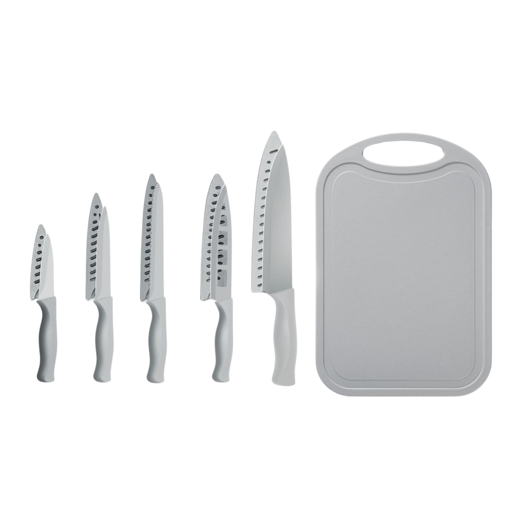 Este set completo ofrece practicidad y estilo, ideal para preparar todo tipo de alimentos. Incluye cuchillos esenciales y una tabla de picar para facilitar el trabajo diario en la cocina.